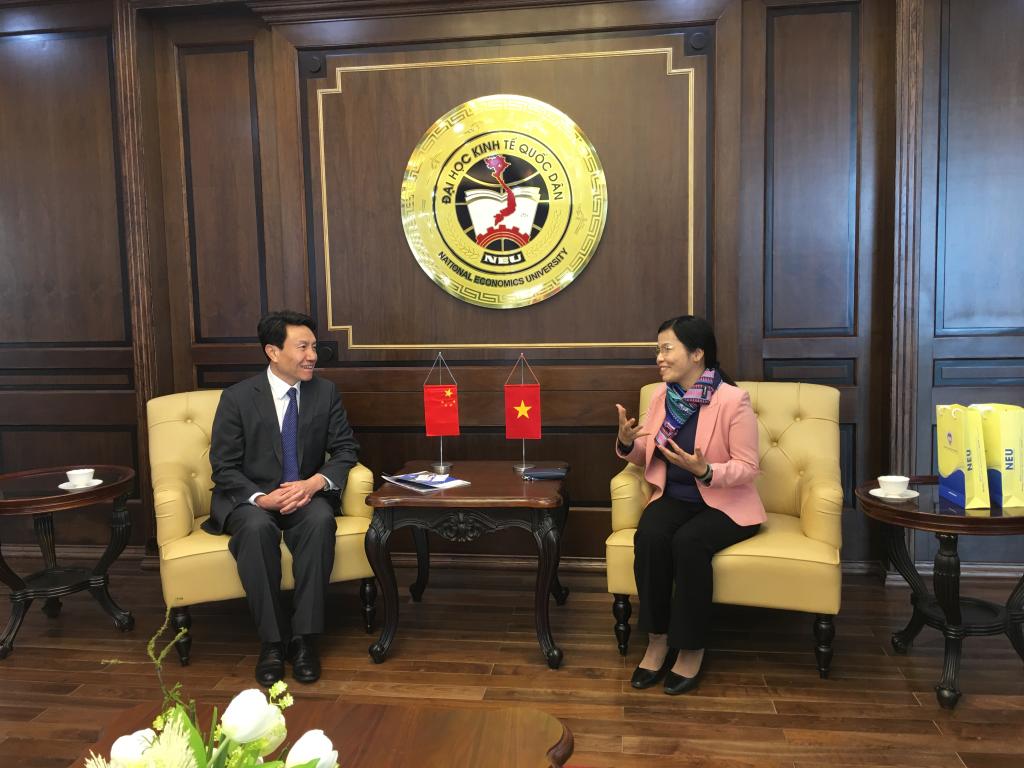 12月12日,代表团访问越南国民经济大学,受到越南国民经济大学副校长陈氏云花的热情接待。白光昭介绍了我校办学历史、师资队伍建设和财富管理特色建设,宣讲了党的十九届四中全会精神,介绍了党委领导下的校长负责制、二级学院党政联席会议等中国大学办学治校相关制度。陈氏云花介绍了越南国民经济大学党建工作、国际合作交流以及越南高校的运行模式和管理制度。双方围绕金融学专业人才培养、干部培训、学生互派和教师交流等进行了深入探讨。随后,代表团参观了国民经济大学办公楼、教学楼、图书馆、研究生答辩室等。