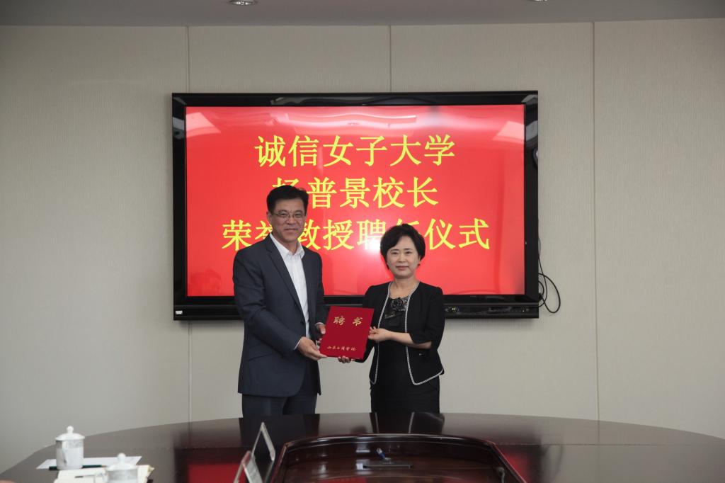 杨普景在接受聘任时发表感言。她表示,非常荣幸受聘为山东工商学院名誉教授,以此作为两校合作与交流的平台,不断提升两校合作的质量和水平。