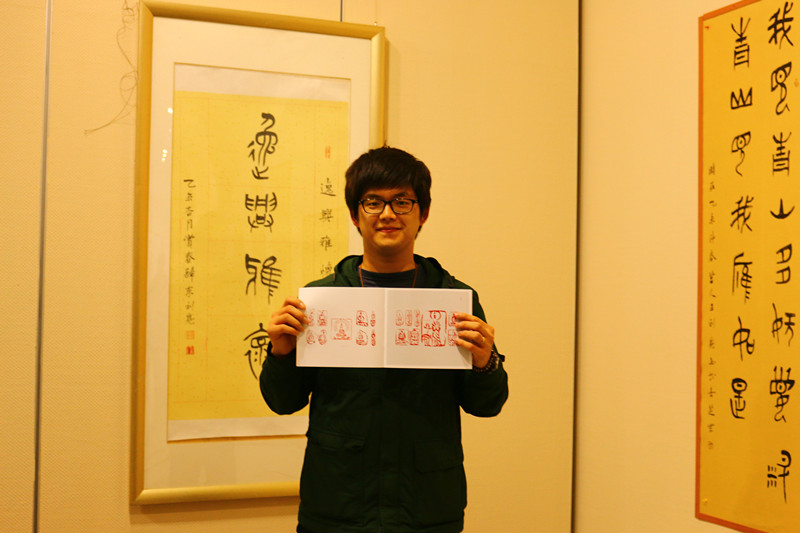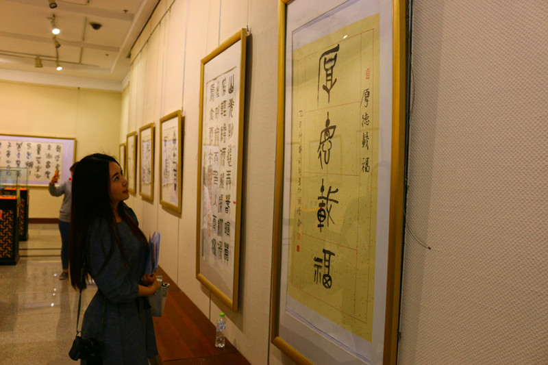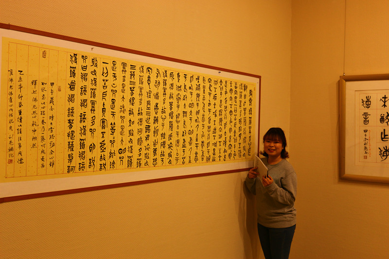 中华汉字是华夏民族的文华瑰宝,从甲骨文走来,历经金文、篆书、隶书、楷书之路,抒写着中华民族丰厚的文华底蕴,历史悠久,源远流长。留学生代表们欣赏着或行云流水或刚劲有力美轮美奂的作品不禁感到新奇并为之惊叹,汉字的魅力是无国界的,会展里洋溢着浓郁的文化气息,主办艺术家王理事亲切地向留学生悉心讲解并合影留念。